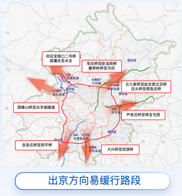 此外,9月30日下午15時起城市路網(wǎng)交通量將明顯加大,17時至19時路網(wǎng)壓力最為突出。城區(qū)東西部主要環(huán)路北向南,蓮石東路、通惠河北路、豐體南路等聯(lián)絡線,京藏、京承、京開、京港澳、機場高速等主要高速公路出京方向及六環(huán)路部分路段易出現(xiàn)車行緩慢。馬甸、西便門、月壇、朝陽門等區(qū)域交通壓力較大。
